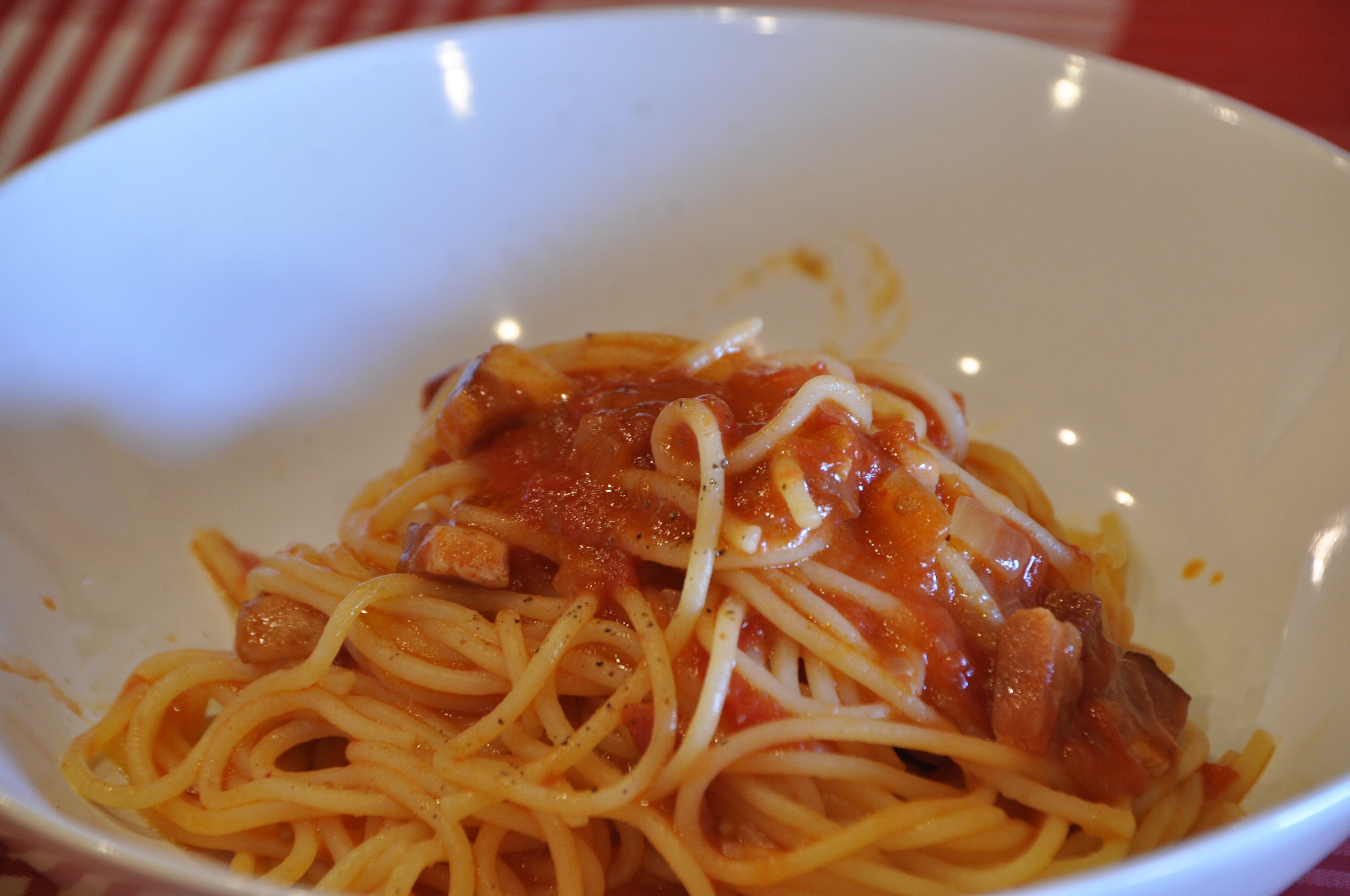 「淡路産タマネギとベーコンのトマトソース」